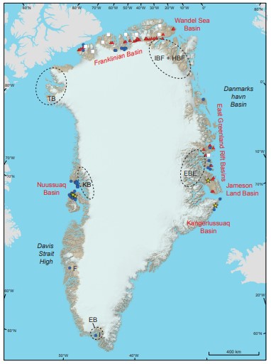 Fig. 2 Map of Greenland showing distribution of petroleum steeps and stains. Red triangles: Petroleum seepage and stains associated with source rock. Blue circles: Petroleum seeps and stains, migrated. White squares: Solid bitumen associated with mineral occurrences. Yellow stars: Gas seepage and gas-rich springs. Red text: Basins with petroleum seeps or stains including Nuussuaq Basin, Franklinian Basin, Wandel Sea Basin, East Greenland rift basins, Jameson Land Basin and Kangerlussuaq Basin. Dotted black lines: Outline of Proterozoic basins or their main outcrop area without petroleum seeps and stains. EB: Eriksfjord basin. KB: Karrat basin. TB: Thule Basin. IBF: Independence Fjord Basin. HFB: Hagen Fjord Basin. EBB: Eleonora Bay Basin. F: Fossilik. I: Ilímaussaq.