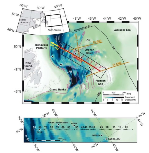 Figure 1. Location of the OBWAVE profile (this paper), coincident MCS profile Or0–122 and previous wide-angle seismic profiles, FLAME (Gerlings et al. 2011), 86-6(8) (Chian et al. 2001) and Line 1 (Keen & Barrett 1981), and selected boreholes (black filled circle with white outline). Inset shows the location of the study area relative to eastern Canada. Background shows the basement depth (Louden et al. 2004) in colour scale and bathymetry with depth contours 100, 500 and 1000 m. Purple lines are faults defined by Enachescu et al. (2005). Black lines are magnetic anomalies and fracture zones. Model distances are in red with labelled numbers. Thick red line is the shot line. Small black filled circles are locations of OBSs. Black rectangle shows detailed area plotted in the lower panel with OBSs numbered in black (white where background is dark). OK, Orphan Knoll; JAB, Jeanne d’Arc Basin; FP, Flemish Pass; BF, Bonavista Fault; WSF, White Sail Fault; MuF, Murre Fault; MeF, Mercury Fault; CBTZ, Cumberland Belt Transform Zone; FZ, Fracture Zone.