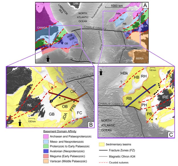 Figure 3 (A) Bathymetry map of the North Atlantic Ocean subdivided by inferred basement affinity of continental crust. (B) Enlarged bathymetry map with sedimentary basins (yellow) of the region surrounding the highlighted Orphan Basin (OB), with the locations of seismic lines NL1, NL2, and NL3, and nearby well tops (circles). The primary seismic line NL1 is shown in blue, the secondary seismic line NL2 is shown in red and NL3 is shown in orange. (C) Enlarged bathymetry map with sedimentary basins (yellow) of the region surrounding the highlighted Rockall Basin (RB), with the locations of seismic lines IR1 and IR2, and nearby well tops (circles). The primary seismic line IR1 is shown in blue and the secondary seismic line IR2 is shown in red. Magnetic Chron A34 from. The enlarged circle in (B) corresponds to the well used to support the seismic interpretation. Sedimentary basin outlines for the o_shore Newfoundland and Labrador margin from the Department of Natural Resources, Government of Newfoundland Labrador, for the Irish margin from the Department of Communications, Climate Action & Environment of Ireland, and for everywhere else from CGG’s Robertson Basins & Plays. Abbreviations: EOB, East Orphan Basin; FC, Flemish Cap; FPB, Flemish Pass Basin; FZ, Fracture Zone; GB, Grand Banks; GS, Goban Spur; GRN, Greenland; HB, Hatton Basin; HBk, Hatton Bank; JDA, Jeanne d’Arc Basin; IRE, Ireland; NL, Newfoundland; OK, Orphan Knoll; PB,