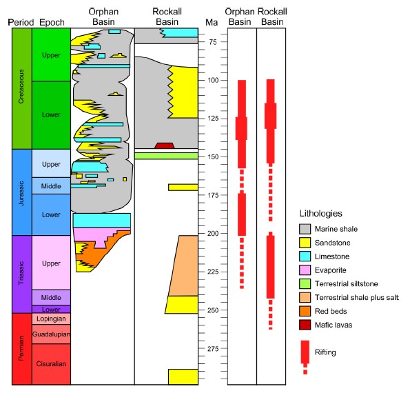 Figure 4. Simplified lithostratigraphic chart from the Permian to the Cretaceous for the Orphan Basin and the Rockall Basin. Orphan Basin chart adapted from and Rockall Basin chart adapted from.