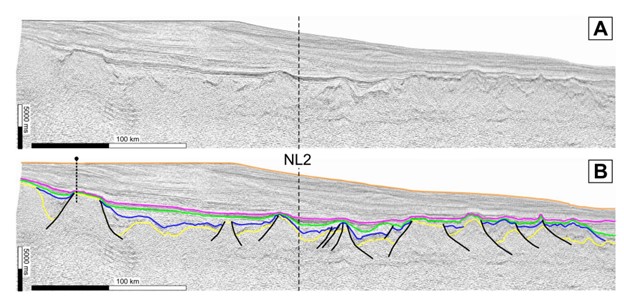 Figure 5. (A) Uninterpreted seismic line NL1 in the Orphan Basin (blue line in Figure 3B). (B) Interpreted seismic line NL1. Seismic horizons: basement, yellow; top of the Jurassic, dark blue; top of the Lower Cretaceous, green; top of the Upper Cretaceous, pink; top of the Cenozoic, orange. The solid black lines indicate faults. Location of the highlighted well (large circle in Figure 3B) is shown by dotted black line topped by the circle in panel B. The dashed black line indicates the intersection with NL2