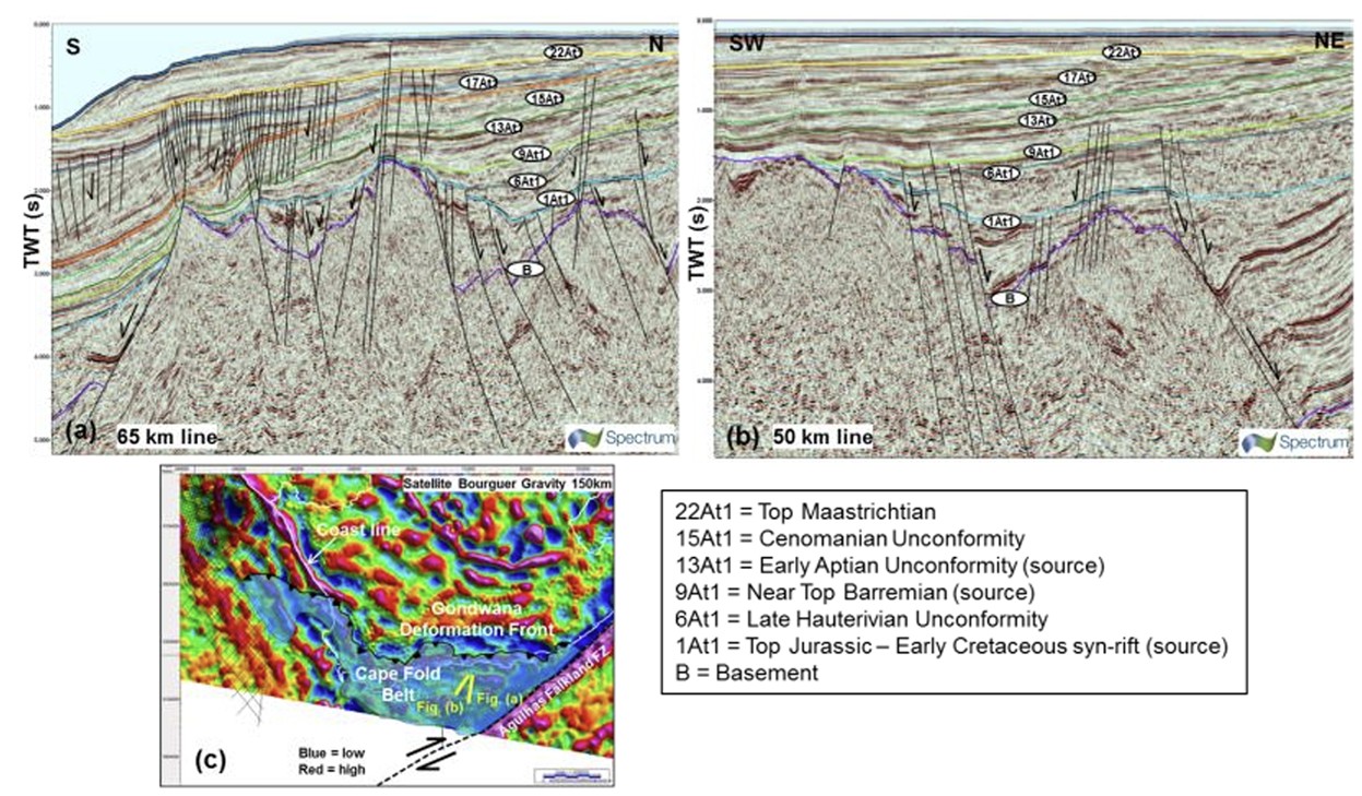 Figure 1. Undrilled basement highs identified on reprocessed 2D seismic profiles in the Pletmos (Figure b) and Southern Outeniqua (Figure a) sub-basins. The line location is indicated in Figure (c). Pre-rift Cape Fold Belt interpretation is based on gravity and seismic data. Hot colours on Bouguer gravity anomaly of 150 km resolution indicate basement high areas.