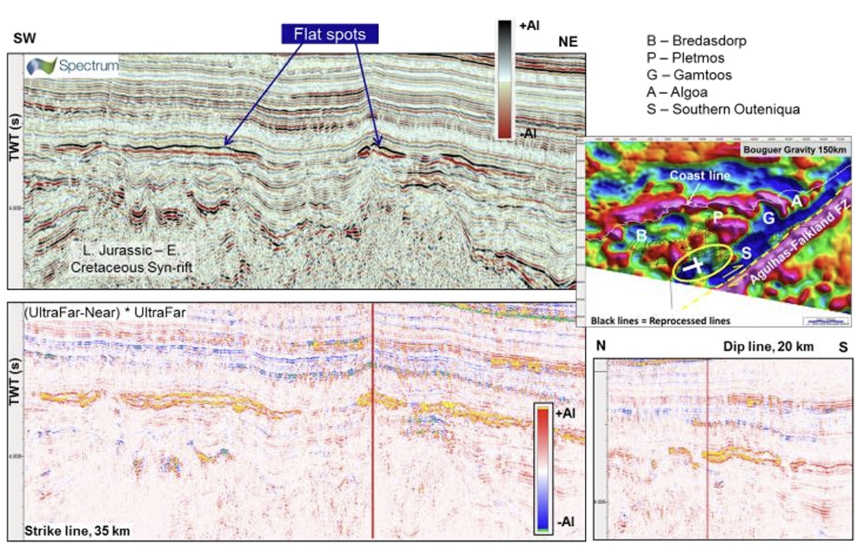 Attribute anomalies derived from the reprocessed seismic data indicate the presence of direct hydrocarbon indicators (DHI’s). Examples of up to 15 km long Late Cretaceous flat spots (interpreted as fluid-water contacts) are identified within bright amplitude reflectors of basin floor fan geometry (Figure 3). These high amplitude reflectors are also supported by AVA attribute anomalies on both strike and dip lines (Figure 3) and are interpreted to indicate the presence of gas. Resource estimates for these plays are significant and the improved imaging of the reprocessed seismic allows for significant risk reduction and supports future exploration for giant discoveries, unleashing the potential of this underexplored southern corner of Africa.