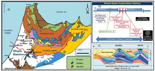 Figure 1: Rharb Basin: a) Location map showing some early discovered oi and gas fields. b) Schematic of the exploration history of the Rharb Basin. c) Schematic structural section through the Bou Draa and Tselfat oil fields.