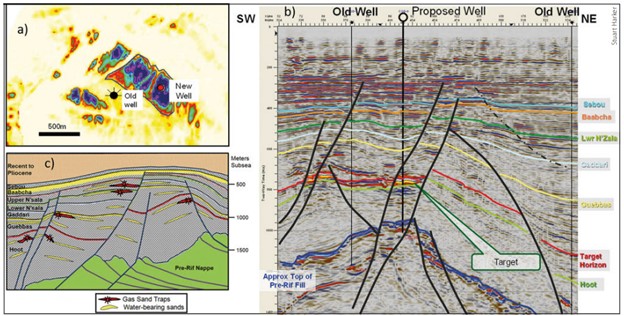 The example shown in Figure 5a–b illustrates the accurate placement of a gas discovery only 800m away from an abandoned well, based on amplitude extraction and geological understanding of the trapping mechanism. The faulting as shown is currently normal over the crest of a thrust anticline in the Nappe. The effective keystone stretching of the overlying younger rocks has created the structural trap and provided a migration pathway for hydrocarbons generated from the Jurassic/Cretaceous source rocks. Sourcing from the coeval, organically lean Miocene mudrocks is unlikely to provide local biogenic gas and the more likely source is considered to be the biogenic degradation by bacteria of an original thermogenic liquid phase hydrocarbon. This has been also reported by Sea Dragon Energy for their recent discovery in the Lalla Mimouna Block located just to the north of the previously successful Sebou Block in the Rharb Basin. The apparent lack of reservoir quality rocks in the few wells drilled to date into the ‘Nappe’ succession may locally downgrade the prospectivity of those strata.