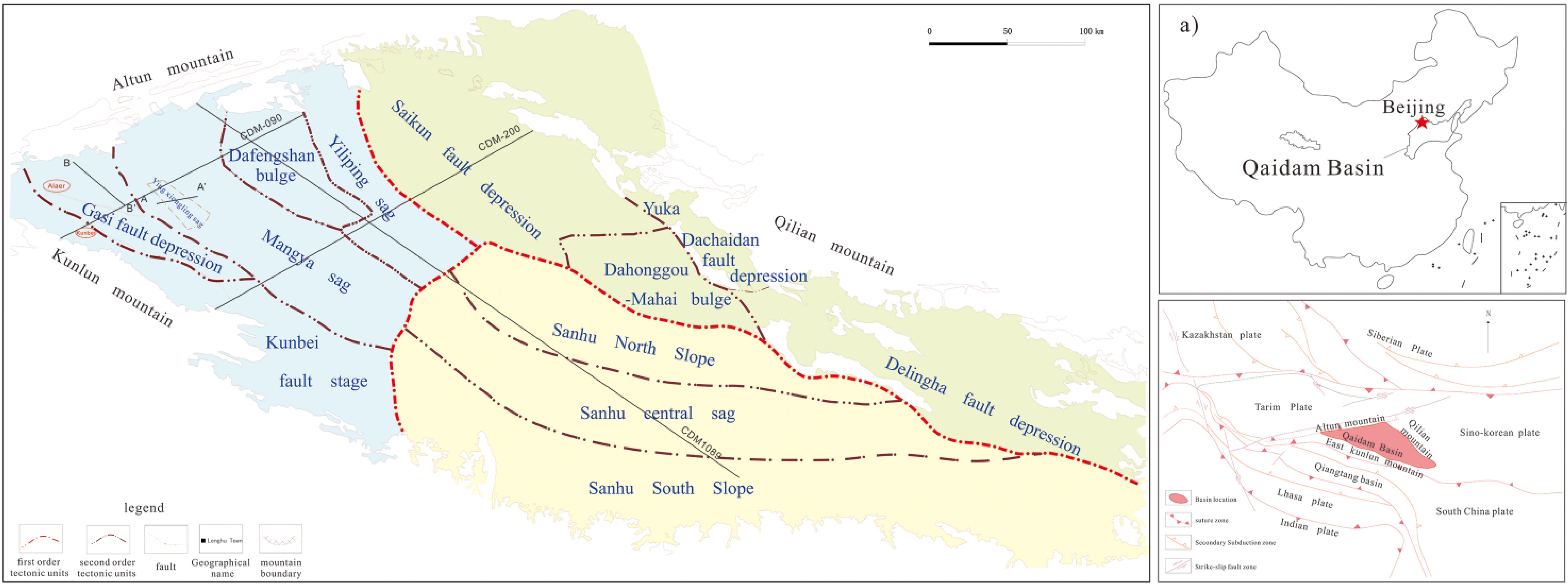 The Qaidam Basin is the only large continental oil- and gas-bearing basin in the Qinghai–Tibet Plateau where large-scale reserves have been discovered and large-scale productions have been built. The collision and compression of India and Eurasia during the Cenozoic period and the uplift of the Tibetan Plateau are among the most important geological and tectonic events of this period, and is denoted as the “Himalaya Orogeny” by scholars (Yu et al., 2017; Zhang et al., 2013). The Qaidam Basin in the northeastern margin of the Plateau is a large continental basin that began to form in the Cenozoic era, and its formation and tectonic evolution are closely related to the Himalaya Orogeny (Burchfiel et al., 1989; Gaudemer et al., 1995). Many scholars have conducted in-depth and extensive studies on the geometric, kinematic, and dynamic characteristics of the formation and evolution of the Qaidam Basin, obtaining numerous important results.
