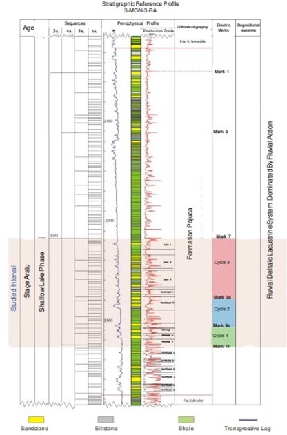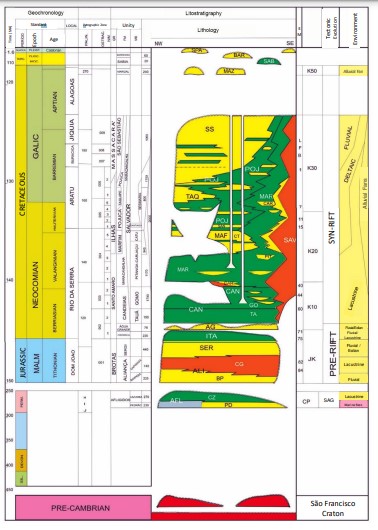 Aratu Stage exhibits a high volume of hydrocarbons in the fields of Miranga and Araçás, in addition to other smaller fields (Figueiredo et al., 1994). The nature of its sedimentary section, which in much of the basin comprises the Pojuca Formation, facilitates the geological interpretation, since it is characterized by the cyclicity of several orders of magnitude; the consequence of this, is the repetition of sedimentary facies that seems to have been connected to shallow marine water.
