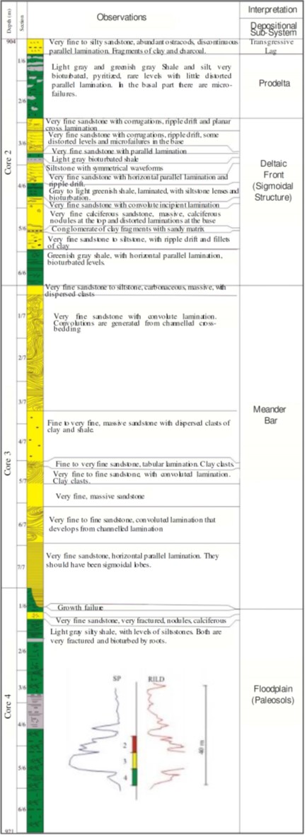 As an easy indication of the presence of these fluvial systems, it is enough to observe the curves of the spontaneous Potential Profiles (SP), which are of the “normal” type (Saitta-Bertoni and Visher, 1968). Marginal dykes, which separate point bar or river channel areas of the flood plain are characterized by the abundance of climbing ripples or ripple drift. Floodplains, by their nature, essentially clayey, when dried, become paleosols, which exhibit singular characteristics, such as fracturing type, and the presence of plant roots (Fig. 6). These characteristics are found in the core of well 3-MG-99-BA.