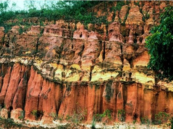 With the high sedimentation rate found in the rift, the lake became progressively shallower. Sedimentation became dominated by rivers and is characteristically deltaic. As observed in modern tectonic lakes, these deltas have a web shaped conformation whose distributaries advance inwards toward the lakes, with pronounced marginal dikes. The transition between deep lake and shallow lake occurs in the younger portion of Rio da Serra Stage, a situation in which the delta front was influenced by small channels (delta-front troughs, according to Klein et al., 1972), when it formed the so-called slurry flows, forming the Pitanga sandstones. The characteristic delta phase begins in the sandstones of the Marfim Formation and extends to the middle of the Buracica Stage (São Sebastião Formation). It is at this stage that lutokinetic uplift of clayey masses of the prodelta also occurs.