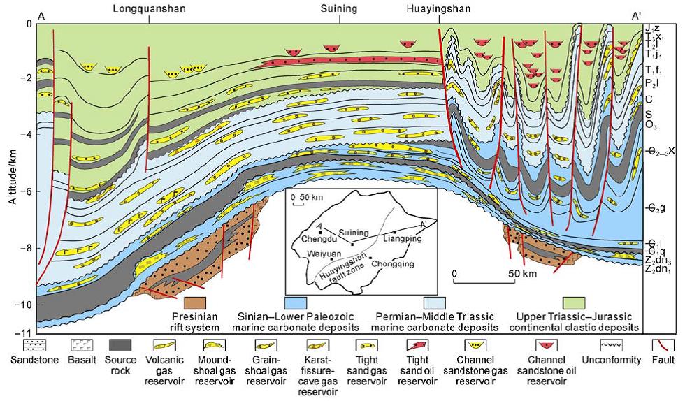 The Sichuan Basin is located at the northwest margin of the Yangzi plate. It is bounded by the squeezing action of the eastward thrust nappe structure of the Tibetan plateau and limits of the perimeter orogenic belt, forming a diamond border with a distinct north– eastward trend. The basin margin is a sedimentary and tectonic basin due to the Longman mountain structural belt, the Qinling orogenic zone and the Songpan–Ganzi fold belt. The Sichuan Basin is an important part of western China’s major oil and gas field.