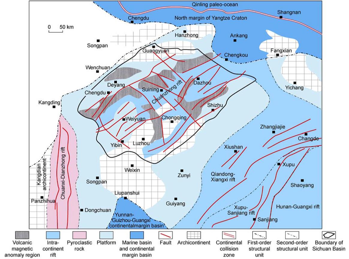After the unified basement was formed during the Jinning Movement, the Yangtze Craton was influenced by the break-up of the Rodinia Supercontinent, which led to a N–E horst-graben basin structure. In the periphery of the Sichuan Basin, the Chuanxi-Dianzhong rift, the Qiandong-Xiangxi rift, the Xupu-Sanjiang rift, and the Hunan-Guangxi rift were developed. Based on the interpretation of geophysical data, a N–E-oriented intra-continental rift may exist in the interior of the Sichuan Basin (Fig. 3), and two groups of faults (N–E and N–W) were developed, which may be connected to the northern continental margin of the Yangtze craton.
