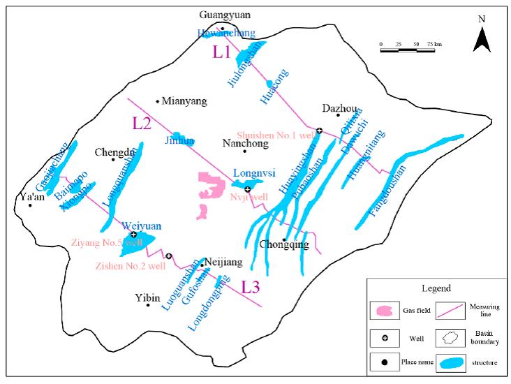 L3 is located in the southern part of the basin, about 400 km long, from northwest to southeast through the western basin Gaojiachang structure, Baimamiao structure, and Xiongpo anticline. In the south of the basin, L3 passed through the Longquanshan structure, Weiyuan structure, Luoguanshan structure, Gufoshan structure, Longdongping structure, and Liziba structure of the six geological structures Ziyang No.5 well and Zishen No.2 well (Figure 5c).