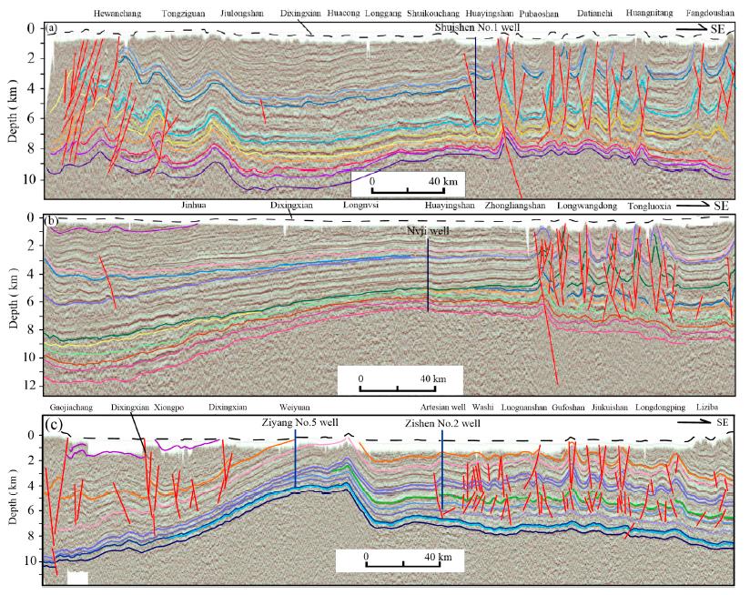 L2 was located in the central part of the basin with a total length of about 390 km. From northwest to southeast, it passes through the center of the Sichuan Basin, from northwest to Mianyang and from southeast to Chongqing. The section passes through the Jinhua, Longnvsi, and Nvjijing structures in the middle of the basin. In the eastern part of the basin, the Huayingshan structure, Zhongliangshan structure, Longwangdong structure, Tongluoxia structure, Mingyuexia structure, and Fengshengchang structure are passed through the six geological structures (Fig. 5b).