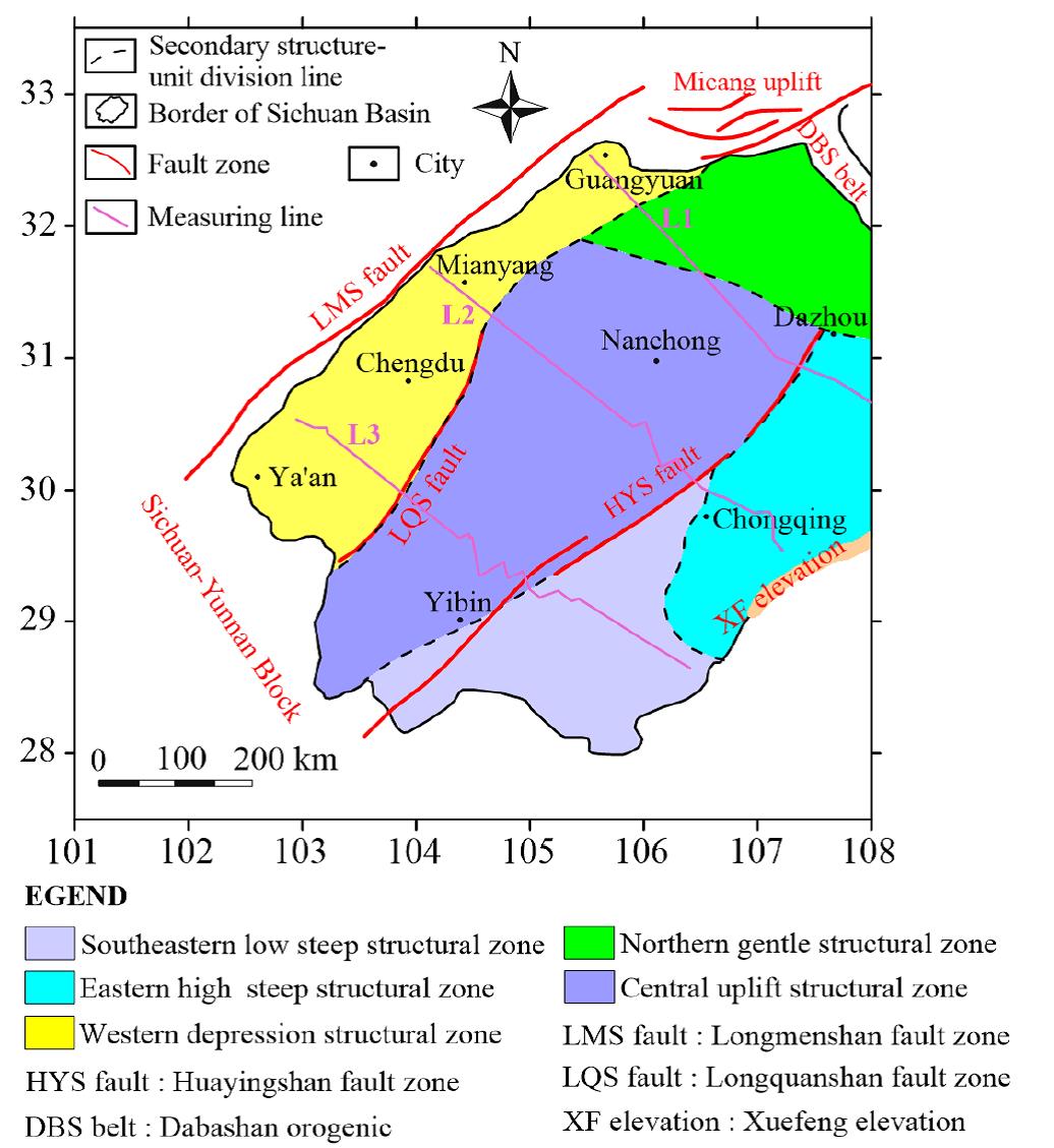 Since the formation of the first sedimentary layer at the bottom of the Sichuan Basin (Sinian Doushantuo Formation), in the process of tectonic evolution and development of the basin, the structure and transformation interact and develop in an episodic manner, forming a unique multi–cycle fold structure in the Sichuan Basin. In order to determine the correlation between the tectonic units of the central and western Sichuan Basin, based on the characteristics reflected by the Bouguer gravity anomaly and the residual gravity anomaly, three regional seismic reflection profiles in the NW-SE direction (L1, L2, L3) were selected for structural interpretation (Figure 4) combined with the results of three seismic reflection profiles in the study area, the tectonic units of Sichuan Basin were delimited comprehensively.