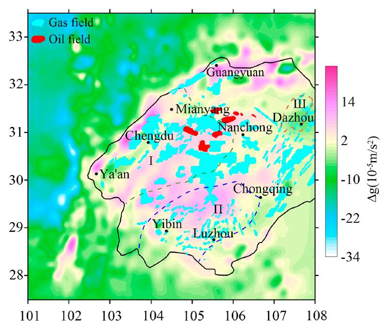 With the development of exploration technology, having a full understanding of the basic geology and petroleum geological characteristics of the Sichuan Basin. Nowadays, most of the large and middle oil and gas fields and proved reserves in the Sichuan Basin are found in the northern and middle of the basin, with more than 20 gas–bearing layers, 173 gas fields and 13 oilfields proved in the basin (The proven reserves of large oil and gas fields are 300 х108 m3). The results of studies have shown a clear Bouguer gravity height, a relatively small variation in the internal of the Sichuan Basin, and a gradual gravity contour all around the basin periphery. Gravity prospecting plays an important role in the census and exploration stage of oil and natural gas. Therefore, there is an urgent need to study the characteristics of the Bouguer gravity anomaly and oil–gas distribution.