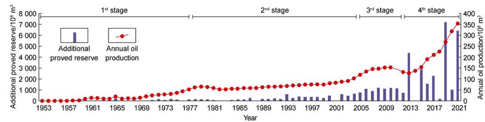 In the fourth stage (2012 to present): gas province exploration, the conventional gas in the Sinian–Cambrian carbonate reservoirs, shale gas in southern Sichuan Basin and tight sand gas in Jurassic were mainly explored, the cumulative proved gas reserves were 20 541 x108 m3, and the gas production exceeded 300 x108 m3 in 2021. In terms of exploration discoveries, reserves and production, the Sichuan Basin is now in the golden period with rapidly growing reserves and production, which is benefited from the integrated development mode of the natural gas industry formed over a long period. This mode is a unique economic development strategy and management mode adapting to the development characteristics and environment of the regional natural gas industry.