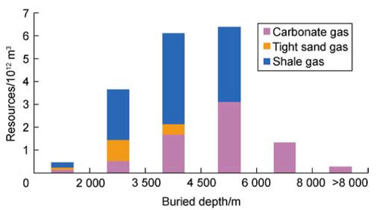 Regarding formations, the remaining recoverable resources are mainly distributed in Permian, Cambrian, Sinian, Middle–Lower Triassic, and Upper Triassic (excluding shale gas), where 17%–30% of the resources are proven. Regarding resource types, the remaining recoverable shale gas is the largest in quantity, accounting for 56.3%, followed by marine carbonate conventional gas (38.2%) and tight sand gas (5.5%). Regarding burial depth, 54% of the remaining recoverable resources are buried in the middle–shallow reservoirs (2000–4500 m), 35% in the deep reservoirs (4500–6000 m), and 7% in the ultra-deep reservoirs (6000–8000 m). Regarding horizontal distribution, the central Sichuan uplift zone contains the remaining resources as high as 3.65x1012 m3, with a volume abundance of 0.9x108 m3/km2, followed by the high and steep structural belt in eastern Sichuan Basin with the remaining resources of 1.75x1012 m3 and a volume abundance of 0.36 x108 m3/km2.