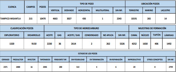 Таблица 1 содержит общую информацию по бассейну Тампико-Мисантла. Общее количество месторождений в бассейне, классификация скважин и информация (включая количество, тип и статус скважины). Есть скважины, которые характеризуются как наземные, морские или озеро.