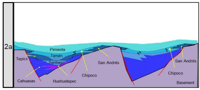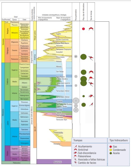 В стратиграфической колонке Provincia Petrolera de Tampico-Misantla (рис. 11) представлены отложения от нижнего триас-юра до новейшего возраста. Ближе к основанию она представлена терригенными отложениями красные пласты, выполняющие горные и грабеновые ямы, перекрытые переходными отложениями с самым высоким содержанием карбонатов в средней юре (формация Huizachal, Huayacocotla, формация Cahuasas, формация Tenexcate, формация Tepexic). В течение верхней юре зафиксировано трансгрессивное событие более высокого порядка, образлвавшие отложения известково-глинистые с высоким содержанием органического вещества (формация Сантьяго, Таман, формация Пимьента) и терригенные отложения, отложившиеся на выступах фундамента все еще появляются (формация Сан-Андрес, формация Чипоко, формация Каситас)