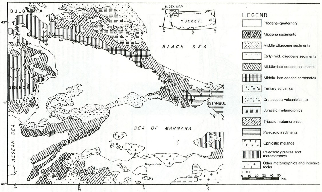 Previous studies have discussed the stratigraphy, facies distribution, and petroleum potential of the basin (Holmes 1961; Kellog 1972; Burke and Uğurtaş 1974; Doust and Arıkan 1974: Keskin 1974; Turgut et al. 1983; Saner 1985). The studies were supported by oil companies evaluating the hydrocarbon prospectivity. Recent drilling and high quality multi-channel seismic data gathered by TPAO have improved our understanding of the basin. The new seismic data shows that basin tectonics were closely related to the evolution and activity of the North Anatolian fault system (Sengör 1979). Our aim in this paper is to demonstrate and describe interrelationships between tectonic styles, basin development, and the hydrocarbon prospectivity of the Thrace basin.