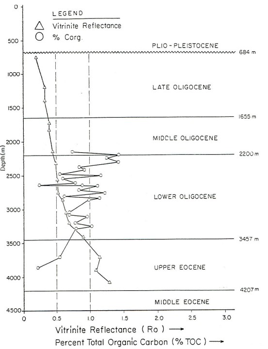 Figures 32.18 and 32.19 show total organic carbon content and vitrinite reflectance values from two deep wells in the basin. The Lower Oligocene sections contain most organic matter and are the best source facies. The maturation of organic matter in the basin starts at around 2500 m depth.