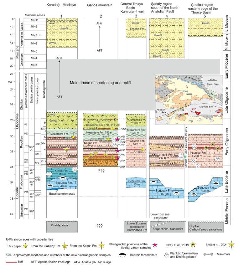 Fig.11 Stratigraphic sections of the Thrace Basin with new and published tuff ages and biostratigraphic data. The stratigraphy is from Siyako (2006b), Erbilet al. (2021), and Okay et al. (2010, 2019) modified to the new age data. The biostratigraphic zonation is after Speijer et al. (2020) and Steininger and Wessely (2000).The Miocene mammal ages are from Ünay & De Bruijin (1984) and Geraads et al. (2005). The inset shows the locations of the stratigraphic sections. The approximatelocations of the biostratigraphic samples that have yielded results, are shown by paleontological symbols