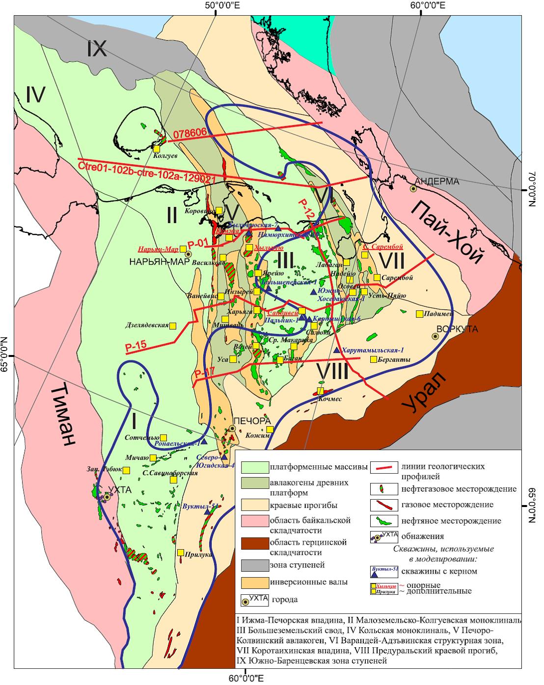 Рис. 1. Тектоническая карта Тимано-Печорского бассейна с базой данных