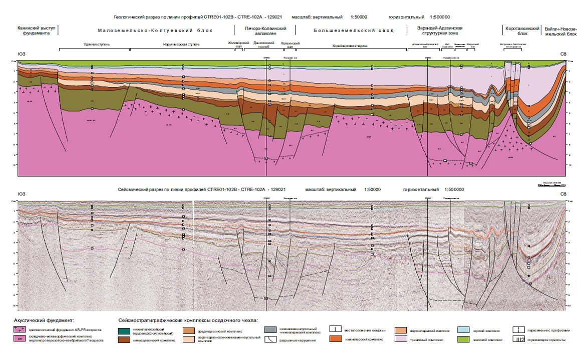 Рис. 3. Геологический разрез по линии профиля CTRE01-102b-CTRE-102a-129021
