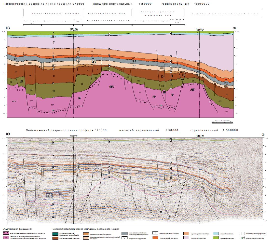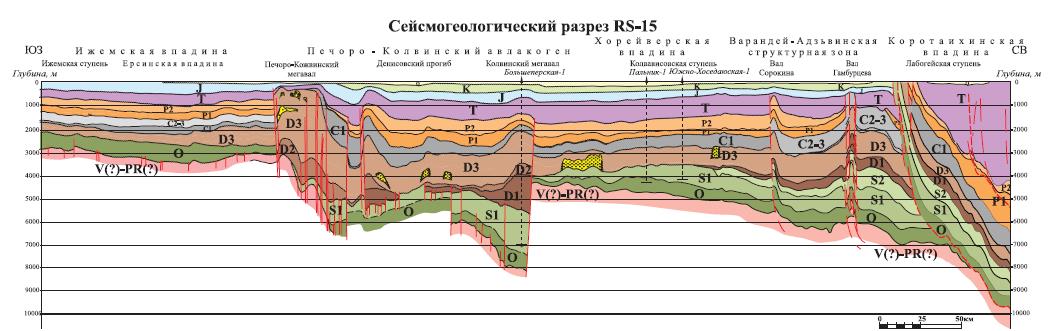 Рис. 4. Геологический разрез по линии профиля P-15 («Изучение и анализ ресурсной базы углеводородного сырья на территории Тимано-Печорской нефтегазоносной провинции»)