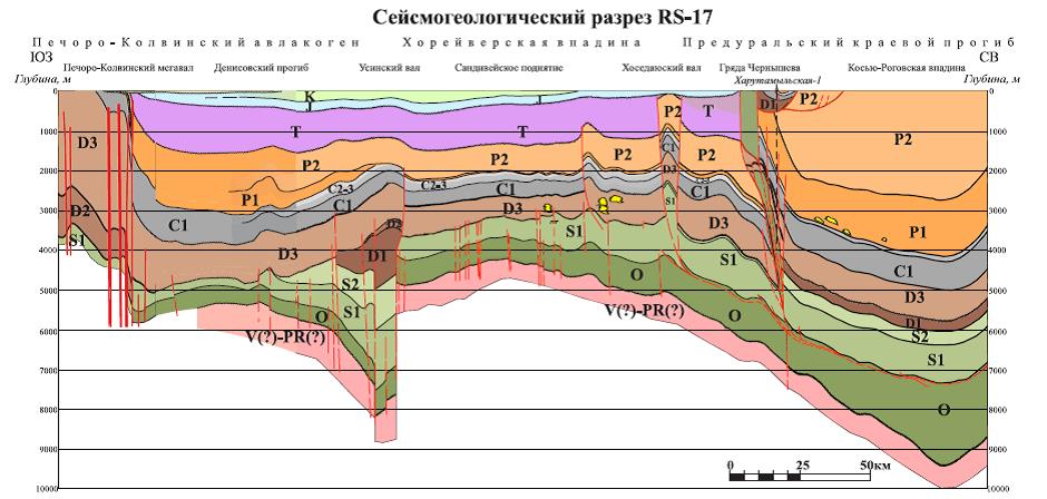 Рис. 5. Геологический разрез по линии профиля P-17 («Изучение и анализ ресурсной базы углеводородного сырья на территории Тимано-Печорской нефтегазоносной провинции»)