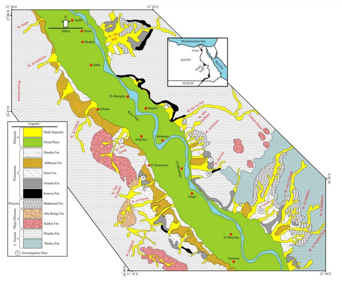 The name of Sohag Basin refers to a Neogene phase that is developed during the Nile evolution in which diferent intermontane basins were created in the Upper Egypt (Philobbos et al. 2015). The Sohag Basin is formed and evolved as a NW–SE-trending local graben that is approximately 30 km wide and 75 km long. Sohag Basin in is bounded mainly by the Early Eocene sequence which is classifed into two formations (Thebes and Drunka formations, Said 1990). Thebes Formation forms mainly the foot of the bounding scarps and is characterized by thinly bedded and laminated limestones with chert bands. Whereas, Drunka Formation conformably overlies Thebes Formation and is diferentiated by its snow white massive-bedded limestones. Sohag Basin shows two main sedimentary stages during its evolution (Mahran and Hassan 2019). The older stage is dominated by fuvial sediments lasting from Late Miocene to Pliocene age, while the younger one is composed of mixed fuvial and lacustrine carbonates of Pleistocene age. The post-Eocene rock units of Sohag Basin can be summarized in the followings (Figs. 1 and 2)v/o