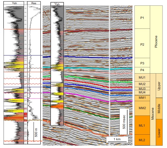 Figure 2. Type well, characteristic 2-D seismic data, and stratigraphic-correlation framework. Good correla[1]tion exists between sandstone and strong amplitude. Possible sequence boundaries occur at the base of stacks of thick-bedded, locally conglomeratic (red), sandstone units (yellow). Shaly zones (gray) are calibrated to low[1]amplitude seismic facies. Age associations are tied to an extensive biostratigraphic database.