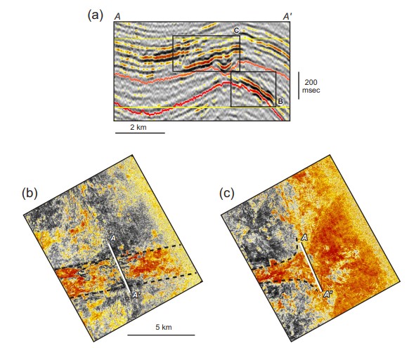 Figure 6. Seismic characteristics of a sinuous channel from the lower Pliocene. (A) Seismic profile showing a discontinuous array of high amplitude due to channel sinuosity. (B) A windowed extraction highlighting the channel pattern and possible splay channels. (C) A directed or piloted seed picked amplitude map showing splays and distributaries at the channel termini.