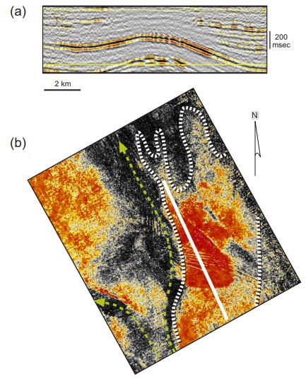 Figure 4. Sandy fan deposit, Cocuite field. (A) Seismic profile across a sheet-like sandstone in the lower part of the upper Miocene. High amplitude and continuous seismic facies correlate to sandstone occurrence. (B) Amplitude extraction of the sheet sandstone. The west margin of the amplitude is sharp and interpreted to be eroded by younger flows. The unit is interpreted to shale out to the north.