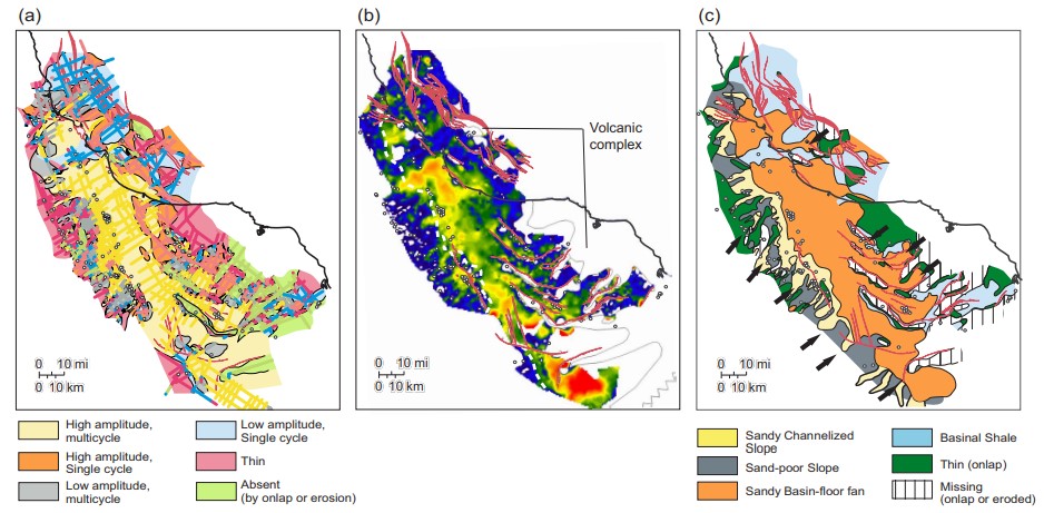 We constructed a total of nine depositional systems maps (two lower Miocene, one middle Miocene, three upper Miocene, and three Pliocene) by combining well-log data, seismic facies, amplitude, and isochron (Fig. 5). Each Miocene map shows a system composed of two main facies belts: one of confined channel complexes and one dominated by basin-floor fans. Proximal features consist of long-lived canyons and smaller, erosional gullies. These channel-fill deposits are mainly thin, coarse grained and locally conglomeratic. The transition from confined channels into less-confined fan facies is evident in each Miocene depositional system. Lower Miocene fan deposits are thick and generally predate structural growth in the basin. The middle and upper Miocene fan deposits are strongly affected by growing structures, particularly in the south part of the basin (Fig. 5). Also from middle Miocene to recent, deposition was strongly affected by growth of the outboard volcanic centers.
