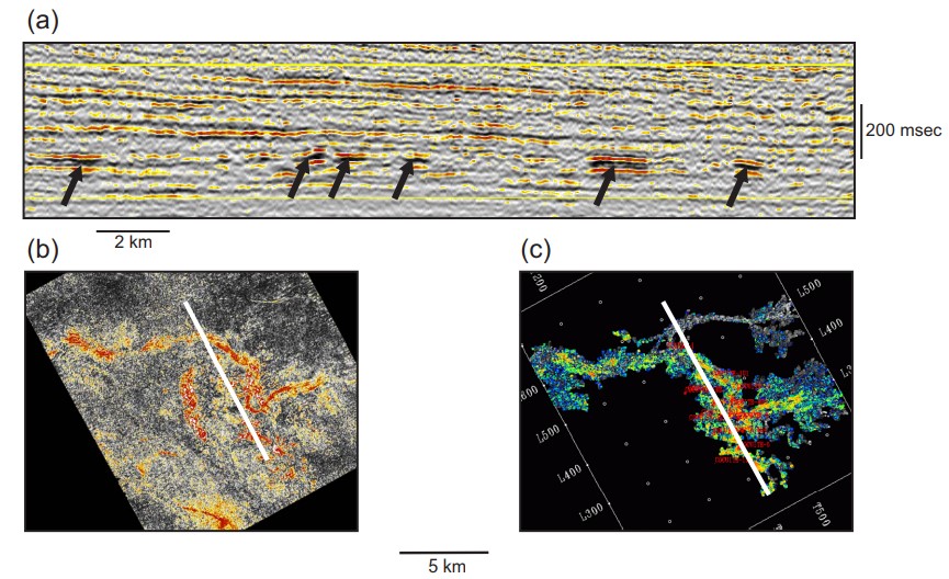 Figure 3. (A) Seismic profile and amplitude extractions of lower Miocene channelized deposits, Cocuite 3-D survey. (B) The linear pattern implies that the change into unconfined fan deposits occurs basinward of the survey. (C) A channel complex develops into a distributive fan. This change marks the slope-to-basin-floor transition. The toe of slope is mapped to shift landward throughout the Miocene.