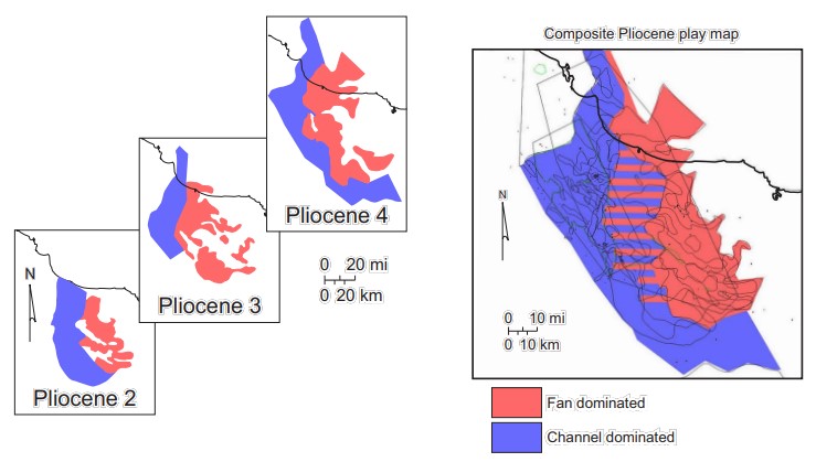 The Pliocene depositional system contrasts with the onlapping Miocene system. Pliocene sedimentation rates exceeded basinal accommodation, and prograding clinoforms dominate the fill. The discretely mapped, highly ero[1]sive channel complexes observed in the proximal Miocene facies belts are replaced by nonerosive channelized slope complexes that fed smaller basin-floor fans. Proximal reservoirs in the Pliocene are narrow, sinuous channels, and basinal reservoirs are fan successions (Fig. 6). Pliocene fan deposits are more limited in extent than Miocene fans.