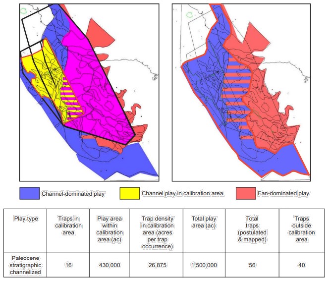 Plays were defined by combining three criteria: stratigraphic age, reservoir type, and trap type. Nine reservoir intervals were combined into four composite units on the basis of distribution and reservoir style: (1) lower Miocene, (2) middle and lower upper Miocene, (3) uppermost Miocene, and (4) Pliocene (Fig. 7). Each of the four composite maps was then divided into channel-dominated and fan-dominated play areas, and the resulting eight facies/age play areas were measured. We assumed that the 4 main trap types occurred in each of the 8 play areas, bringing the possible number of plays to 32. Several more trap types were identified during this exercise (e.g., subunconformity traps), but their numbers were relatively small for establishing a statistical sampling.