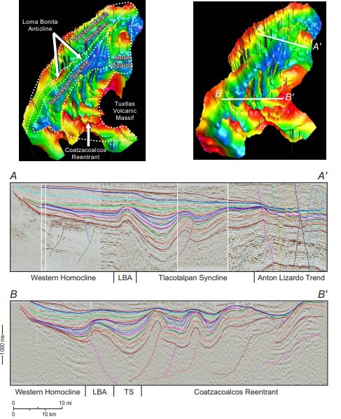 Figure 1. Structural relief map, based on a middle Miocene horizon (green horizon), illustrating structural trends. The composite seismic lines A-A' and B-B' illustrate cross-sectional characteristics of the main structural trends (WH: Western Homocline, LBA: Loma Bonita Anticline, and TS: Tlacotalpan Syncline).