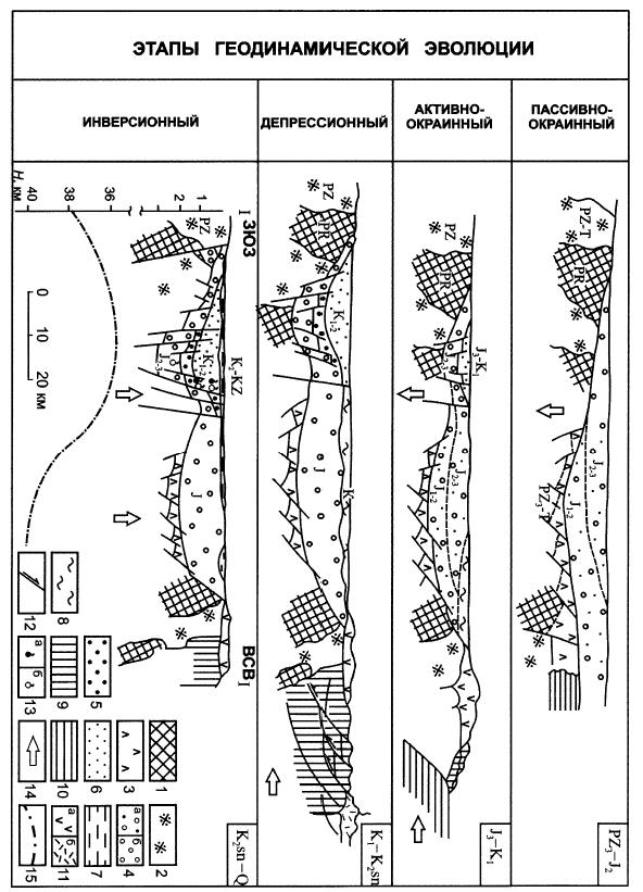Рис. 2. Основные этапы геодинамической эволюции Верхне-Буре инского НГБ: