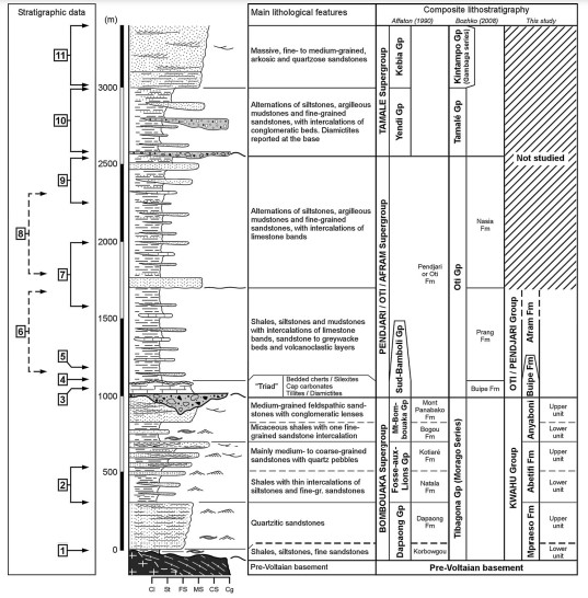 Source: New sedimentological and biostratigraphic data in the Kwahu Group (Meso- to Neo-Proterozoic), southern margin of the Volta Basin, Ghana: Stratigraphic constraints and implications on regional lithostratigraphic correlations. Renaud Couëffé, Marco Vecoli.Precambrian Research 189 (2011) 155–175.