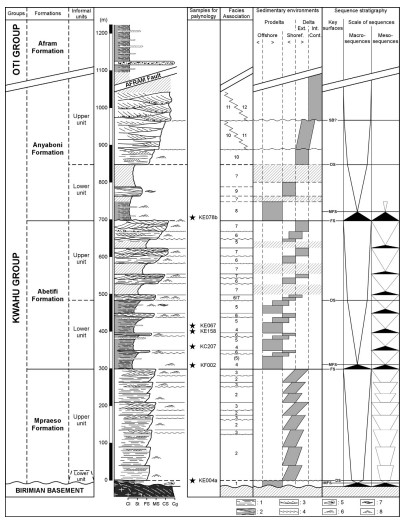 Fig. 3. Synthetic lithologic section of the Kwahu Group in the studied area: lithostratigraphic subdivision, sampling location for palynological analysis, facies association composition, sedimentary environment evolution and sequence stratigraphy. Sedimentary structures: 1, Horizontal bedding; 2, Low-angle, planar cross-bedding; 3, Trough cross-bedding; 4, Planar cross-bedding; 5, Load casts, slumps; 6, Current ripples; 7, Hummocky cross stratification; Wave ripples. Sedimentary environments: offshore/shoreface, lower/upper offshore/shoreface; Cont., continental; Ext./Int. Delta, External/Internal delta. Key surfaces for sequence stratigraphy: SB, Sequence boundary; MFS, Maximum Flooding Surface; FS, Flooding Surface; DS, Downward Shift.