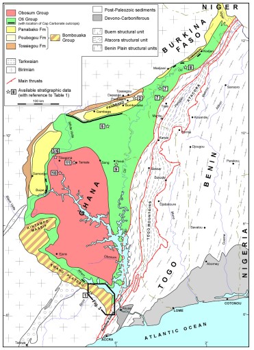 It is located on the West African Shield made of Archean and Palaeoproterozoic rocks, stabilized since about 2 Ga. The West African Craton is exposed in two separate units – the Reguibat Ridge in the North and the Man or Leo Ridge in the South – which are separated by thehuge Neoproterozoic and Palaeozoic Taoudeni basin.At its northern, western and southern margins,the Volta Basin unconformably overlies the Man or Leo Ridge Birimian basement, that consists mainly of rocks deposited in volcano-sedimentary basins, intruded by abundant granitoids between 2215 and 2060 Ma during the Eburnean orogeny. To the East, the Volta Basin is bordered by the front of thrusted rocks that represent external units of the Pan African Belt related to Dahomeyide orogenic event. Different structural units, separated by thrusts, are usually distinguished within this Pan African Belt, with from west to east (Fig. 1):
