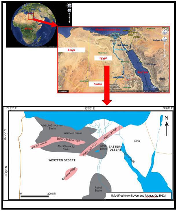 The Western Desert (Figure 1) covers about 700,000 square kilometres which is equivalent to the size of Texas and is about two-thirds of Egypt's land area. Egypt borders the Mediterranean Sea to the north, the Red Sea to the east, Sudan to the south and Libya to the west. Western Desert consists of a few extensional coastal rift-basins including Alamein Basin, Abu Gharadig Basin and Matruh-Shushan Basin.