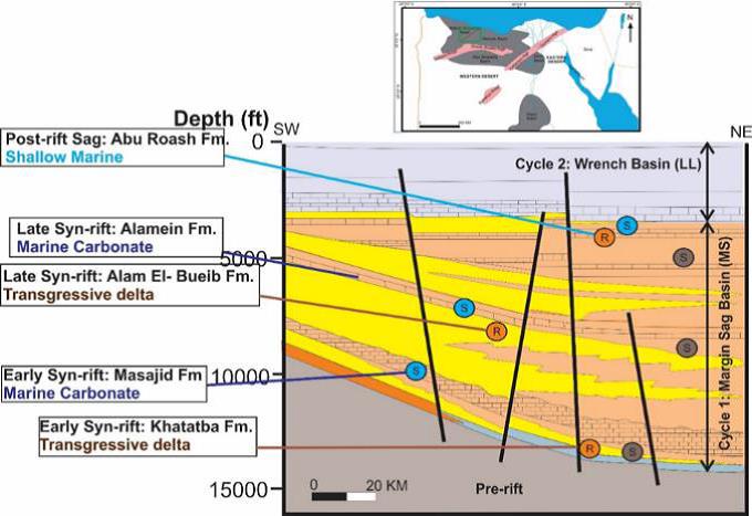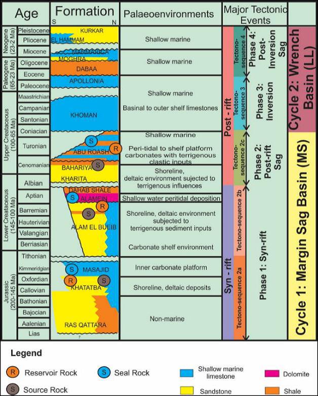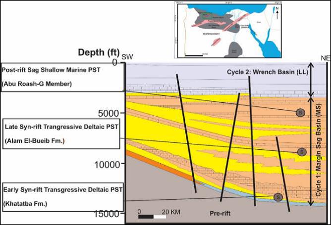 The stratigraphic succession of Western Desert can be divided into four tectono-sequences (Figure 2) which included Tectono-sequence 1: Paleozoic; Tectono-sequence 2: Jurassic-Coniacian; Tectono-sequence 3: Santonian–Late Eocene and Tectono-sequence 4: Late Eocene-Pliocene. Shoushan Basin evolved through two cycles namely Cycle 1: Margin Sag Basin (MS) and Cycle 2: Wrench Basin (LL) (Jong, 2019).