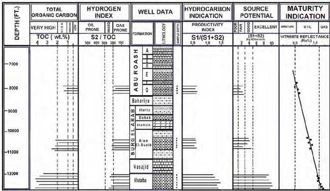 Figure 5: Idealized geochemical log to the well Shushan-1X, showing Rock-Eval pyrolysis data, total organic carbon and vitrinite reflectance measurements (Younes, 2012).