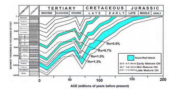 Figure 6: Burial history model of the well Shushan-1X and stages of hydrocarbon generation windows (Younes, 2012).