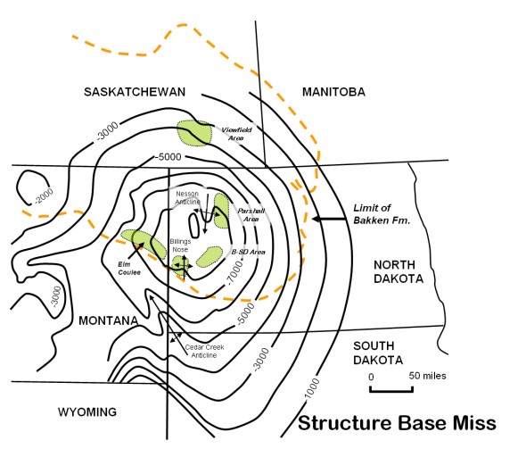 Fig. 4. Index map of the Williston Basin illustrating the structure at the base of the Mississippian. The limits of the Bakken are shown by the dashed line. Recent giant discoveries (the past 10 years) include Elm Coulee of Montana, Parshall area of North Dakota, and the Viewfield area of Saskatchewan.