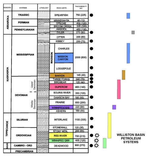 Fig. 5. Stratigraphic column for Paleozoic and Lower Mesozoic units of Williston Basin. Also shown are extents of various petroleum systems. The Bakken petroleum system consists of reservoirs in the lower Lodgepole, Bakken, and upper Three Forks and source beds in the Bakken. Modified from LeFever et al., 1991 and Anna, 2010.