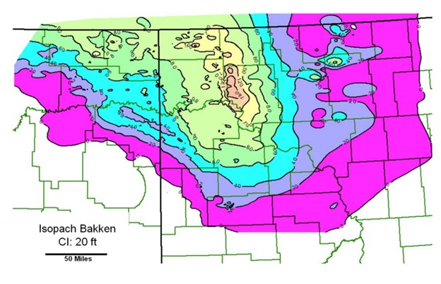 Fig. 7. Isopach map of Bakken Formation, U.S. part Williston Basin. Thickness ranges from wedge-edge to over 140 ft.